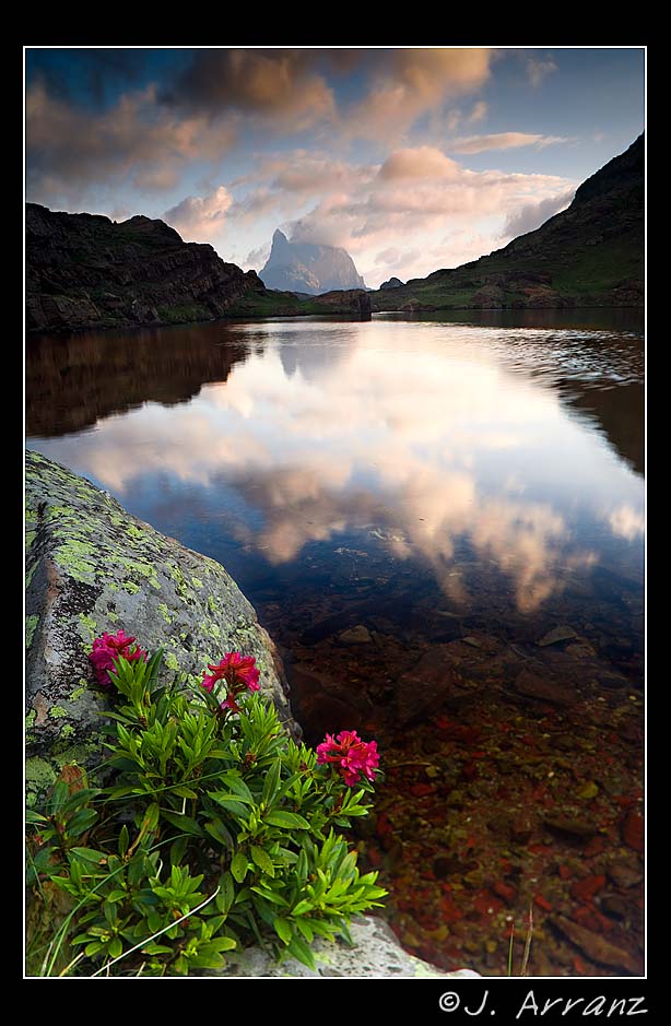 el tiempo de exposición fue de 30 segundos a ISO 100, solo tuve tiempo de sacar uno toma, pues al elevarse el sol, los rayos pasaban por encima de las nubes que seguían apareciendo, así que me volví para el Anayet y comencé a componer con el ibón y el pico al fondo.