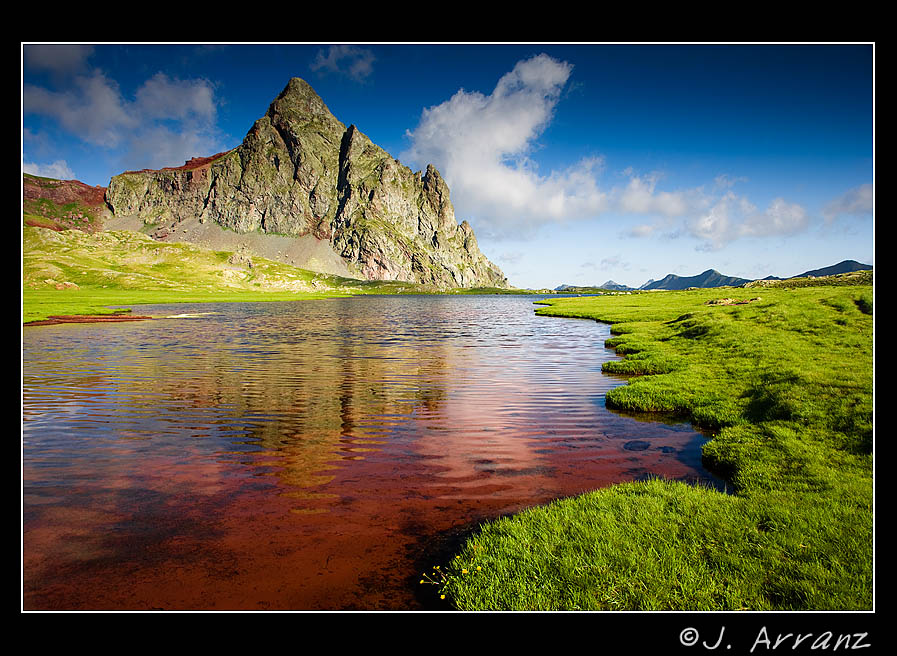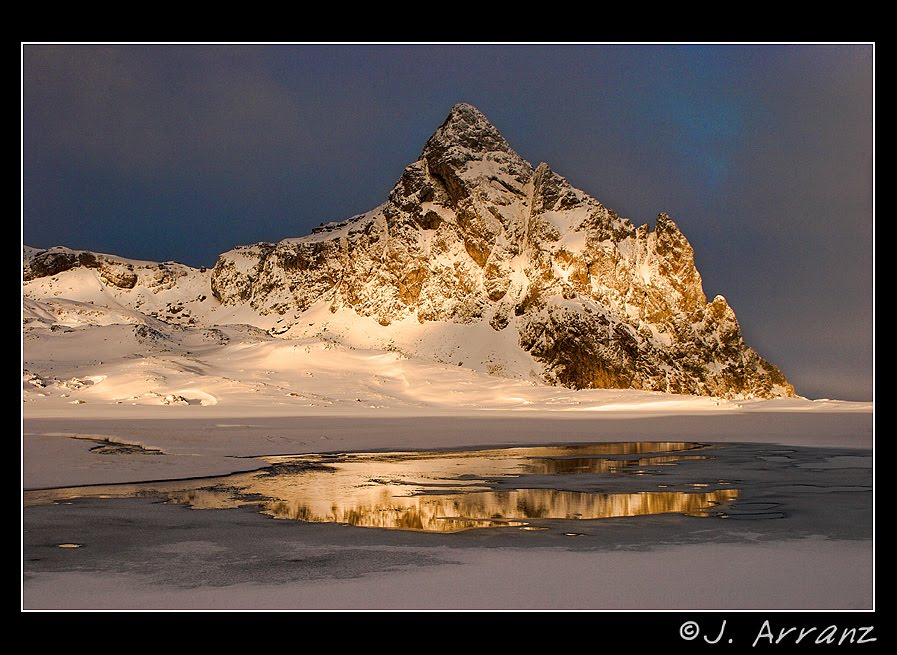 el tiempo de exposición fue de 30 segundos a ISO 100, solo tuve tiempo de sacar uno toma, pues al elevarse el sol, los rayos pasaban por encima de las nubes que seguían apareciendo, así que me volví para el Anayet y comencé a componer con el ibón y el pico al fondo.Según iba avanzando la mañana los claros iban haciendo acto de presencia, con una calidad de luz estupenda que resaltaba los relieves del imponente Anayet, no di por terminada la estupenda sesión que la mañana me había deparado, sin pasarme antes por el ibón inferior donde nuevamente dirigí mi atención hacia el Midi D'Ossau cubierto parcialmente por las nubes que se reflejaba en las tranquilas aguas del lago.